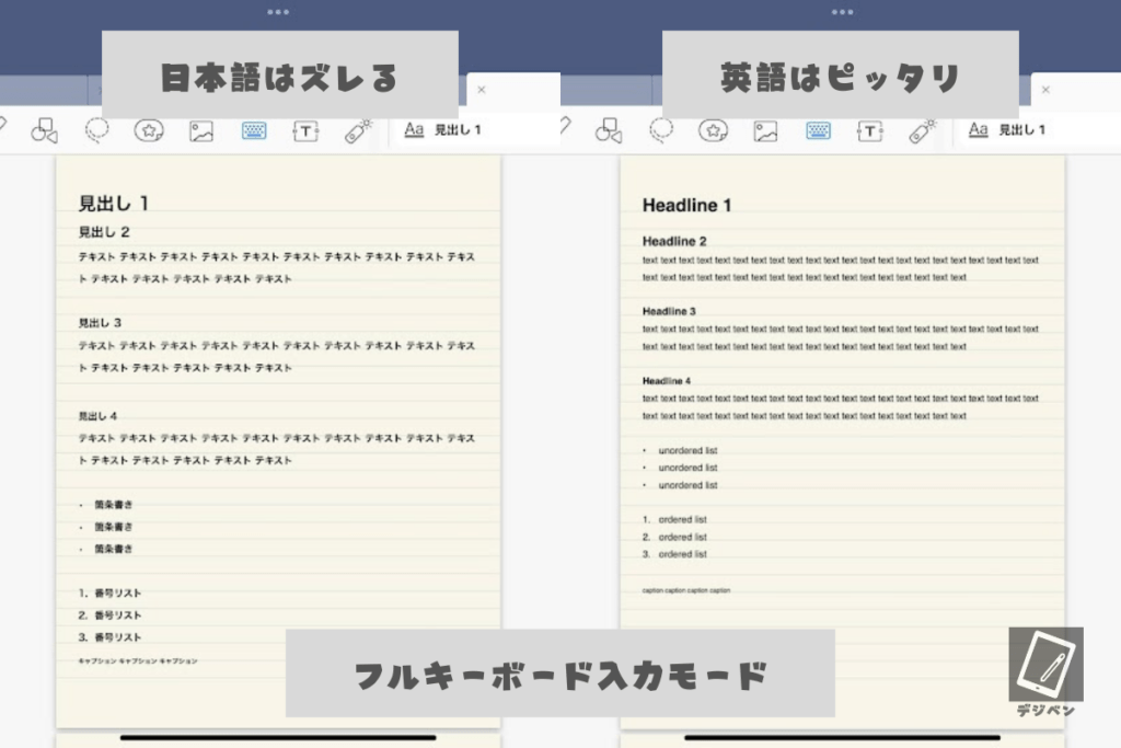 英語版とは異なり、日本語のグッドノートのフルページテキスト入力モードでは、フォントや文字の行間がテンプレートの罫線と完全に一致しません。